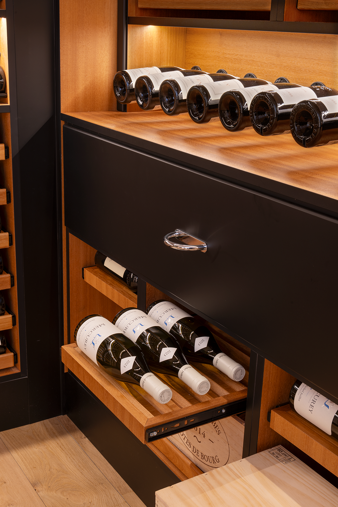 Dieser charakteristische Weinkeller ist das Manifest für unsere Sonderprojekte: Das gleiche architektonische Vokabular kann einen Ankleideraum, ein Badezimmer oder jedes andere vollständig maßgeschneiderte Interieur prägen.